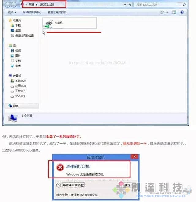 這次能夠連接到印表機了,成功了一半,在線安裝驅動的時候問題又出現了,驅動安裝到一半,提示無法連接到印表機,且顯示0x00000bcb錯誤。