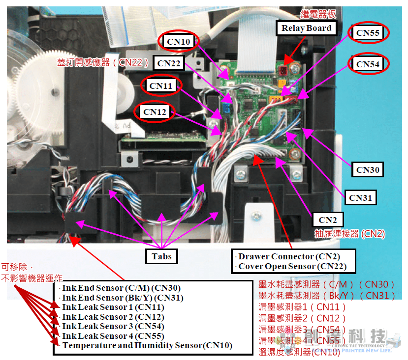 這問題的引起,通常都是廢墨漏出影響到底下漏墨感應器的異常偵測,所以拔掉三條感應器的線(拿掉這功能)就可解決。