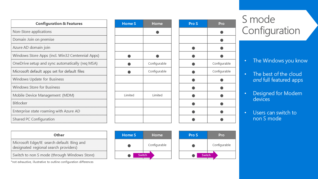 S模式是Windows 2018年4月10日更新所推出的SKU演進。這是在製造時啟用時可在所有Windows Edition上使用的配置。Windows版本隨時都可以升級,如下所示。不過,從S模式切換為一次切換,而且只能以抹掉並重載作業系統來復原。