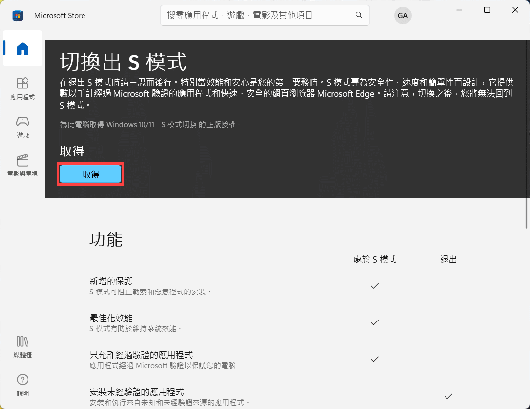 - 在Microsoft Store中出現的([切換退出S模式]或類似頁面)頁面上,選取[取得]按鈕。確認此動作之後,您就可以安裝Microsoft Store外部的應用程式。