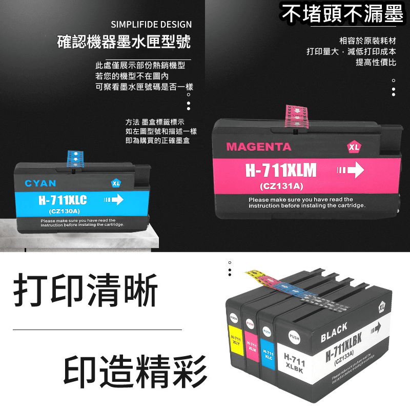 墨盒型號標示:711BK / 711C / 711M / 711Y